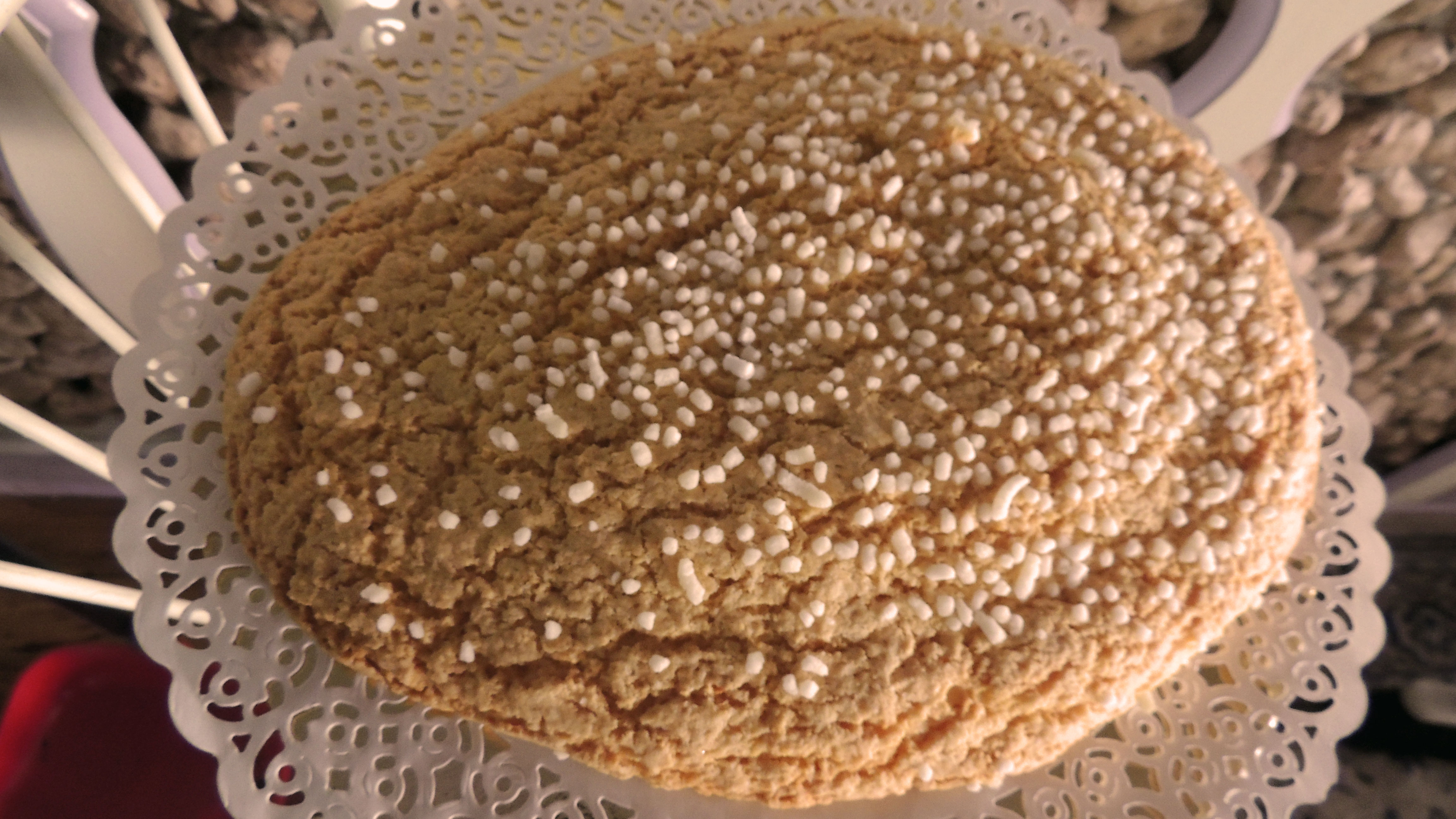 Colore: marroncino chiaro. Aspetto: leggermente allungato, alto circa 3cm, con granella di zucchero sopra. Sapore: fragrante e caratteristico della ciambella artigianale.